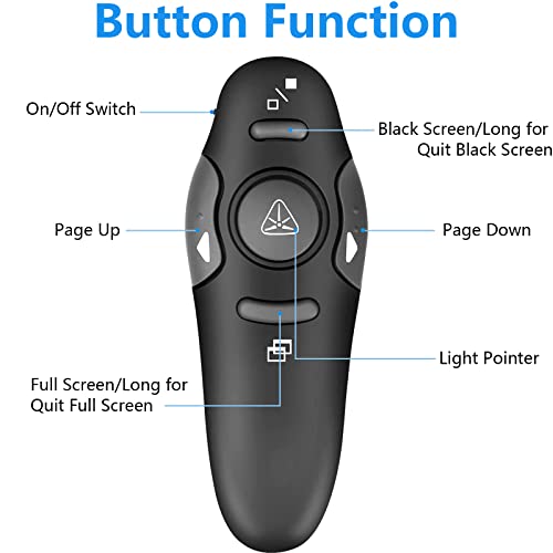 Luce rossa brillante: questo telecomando per presentatore wireless è dotato di una luce rossa brillante che è facile da vedere sulla maggior parte degli sfondi per evidenziare i punti della presentazione. Il raggio di controllo wireless è fino a 100 piedi, liberandoti dal vincolo delle tastiere.