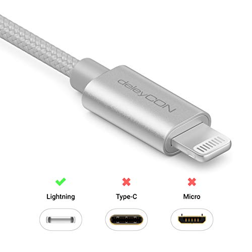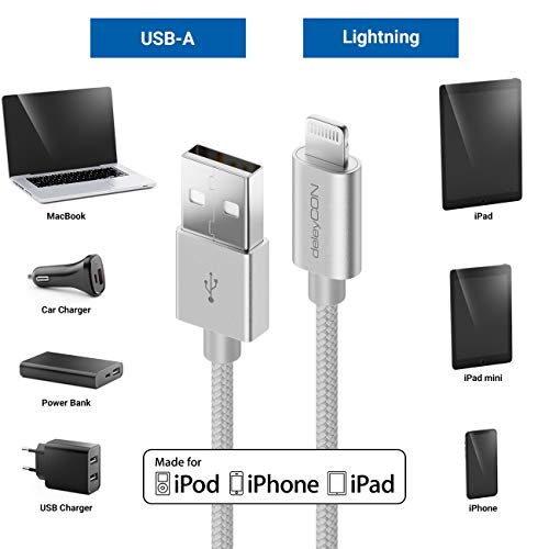 DeleyCON 2m Lightning 8 Pin Cavo di Ricarica USB Apple MFI per iPhone 14 Pro Max 14 Pro 14 Plus 14 SE 13 Pro Max 13 Pro 13 Mini 12 Pro Max 12 Pro 12 Mini Spina in Metallo & Cavo in Nylon - Argento