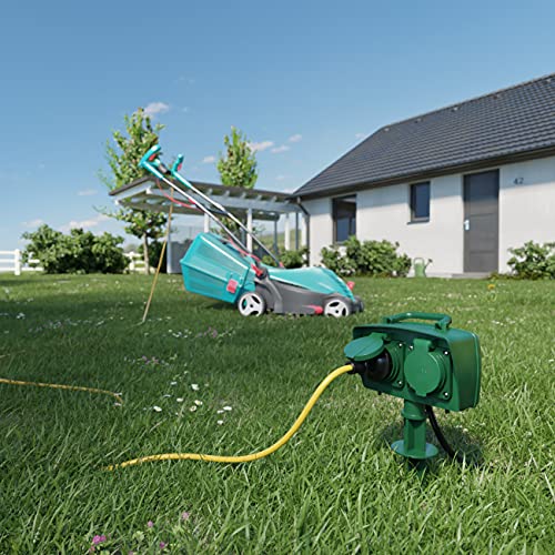 DeleyCON Presa 2 Outdoor con Picchetto Distributore di Corrente Esterni 2 Prese Contatto Protettivo Sicura per Bambini IP44 Protezione Dagli Spruzzi d'Acqua Resistente Alle Intemperie Cavo 5m