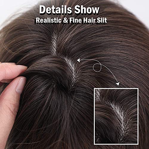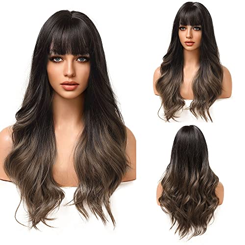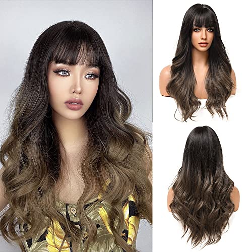 Delgeo Parrucca Lunga per Donna, 61cm/24" Parrucche Sintetiche per Capelli Ondulate Naturali con Frangia, Parrucche Resistente al Calore da Noir a Marroni Chiaro, per Uso Festa Cosplay Quotidiana