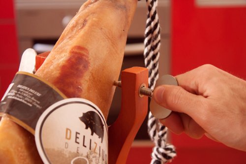 Supporto inferiore in forma di V e vari punti che permettono fissare e centrare il prosciutto