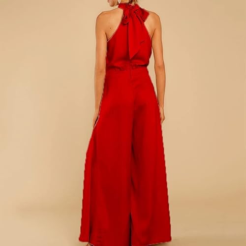 Delle Donne Elegante Senza Maniche Halter della Tuta del Merletto del Raso Up Gamba Larga Allentato Pagliaccetti Lunghi da Cocktail del Partito di Sera (Rosso,S)
