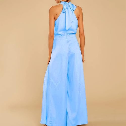 Delle Donne Elegante Senza Maniche Halter della Tuta del Merletto del Raso Up Gamba Larga Allentato Pagliaccetti Lunghi da Cocktail del Partito di Sera (Blu,L)