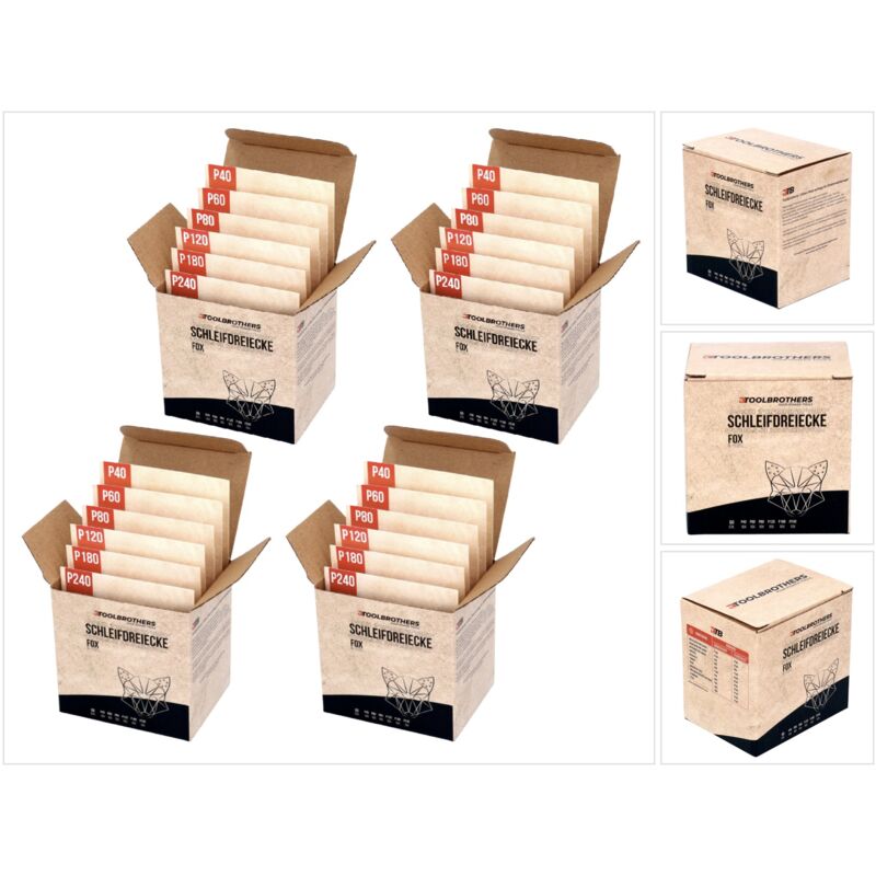 Contenuto della fornitura: - 40x Toolbrothers FOX Triangoli abrasivi 93 x 93 x 93 mm P40 - 40x Toolbrothers FOX Triangoli abrasivi 93 x 93 x 93 mm P60 - 40x Toolbrothers FOX Triangoli di levigatura 93 x 93 x 93 mm P80 - 40x Toolbrothers FOX Triangoli di levigatura 93 x 93 x 93 mm P120 - 40x Toolbrothers FOX Triangoli abrasivi 93 x 93 x 93 mm P180 - 40x FOX Toolbrothers Triangoli abrasivi 93 x 93 x 93 mm P240 Descrizione del prodotto: Toolbrothers si è già fatto un nome come portale di comparazione di utensili e ora, con i nuovi triangoli abrasivi FOX Delta, lancia sul mercato un'ampia selezione di abrasivi con le grane più comuni richieste. I triangoli abrasivi sono ideali per la levigatura di vari tipi di legno morbido e duro, per il trattamento di vernici, pitture, acciaio, alluminio e persino pietra e per la rimozione della ruggine. Le punte abrasive consentono di lavorare con precisione fino agli angoli dei pezzi. Il lato in velcro del triangolo abrasivo garantisce un fissaggio