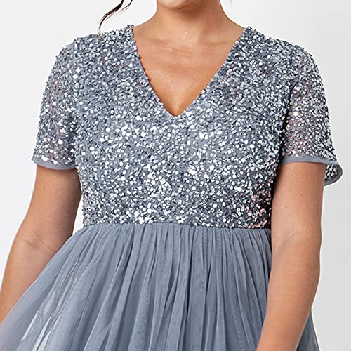 Maya Deluxe Abito da Sera Midi Impreziosito per Le Signore delle Donne Scollo a V con Manica Corta per Il Matrimonio di Promenade Vestito per Damigella d'Onore, Blu Polvere, 34 Donna