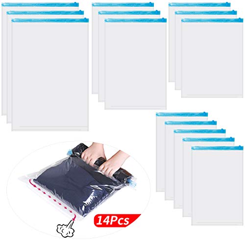 【14 sacchetti sottovuoto in 4 misure: set da 3 pezzi da 70 x 50 cm, set da 3 pezzi da 60 x 40 cm, set da 3 pezzi da 50 x 40 cm e 5 pezzi da 50 x 35 cm (sacchetto sottovuoto da rotolare). Ideale per lo stoccaggio salvaspazio, ad esempio Vestiti piumini biancheria da letto cuscini tappeti tende asciugamani.