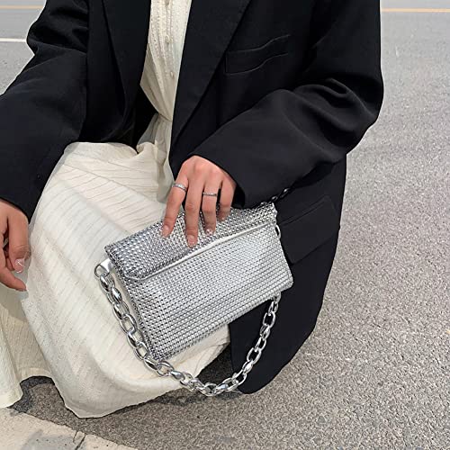 Demiawaking Borsa Strass Donna Borsa da Sera Elegante Borsa a Tracolla con Strass Pochette Argento Cerimonia Lucida Borsetta da Sera Strass per Feste, Matrimonio, Banchetto (Stile B, Catena)