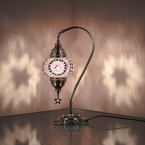 DEMMEX Lampada da tavolo turca marocchina a mosaico, con collo di cigno fatta a mano, lampada da comodino da tavolo, lampada da tavolo decorativa colorata bohémien, viola