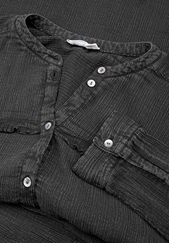 L'elegante camicia con le piccole volant è realizzata in cotone crêpe e ha una superficie morbida e ruvida.