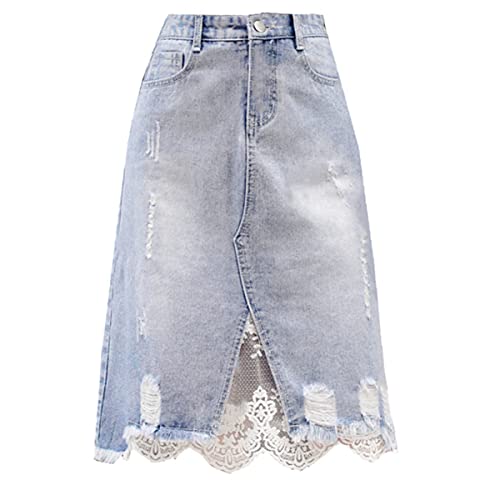 Caratteristiche: Gonne lunghe per il ginocchio del corpo denim da donna, splicing di orlo del merletto, gonna strappata per orlo mischia, tasche, fronte diviso, gonna a-line dolce, lace up, vestibilità slim, vita alta, controllo della pancia, gonna da spiaggia estiva, gonna da ufficio, Soft, Comfort, Chiusura con cerniera, Gonna casual, Gonna del fine settimana, Gonna lunga di alta qualità. Lavaggio a mano raccomandato in acqua fredda per