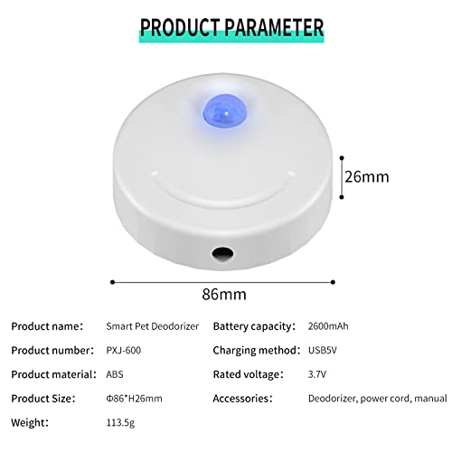 Ricaricabile e sicuro: dispone di un monitoraggio di 24 ore. Alimentato tramite USB, non richiede batterie aggiuntive. L'eliminazione degli odori della toilette per gatti funziona a basso consumo energetico, una carica offre fino a 2-3 giorni o più durata della batteria.