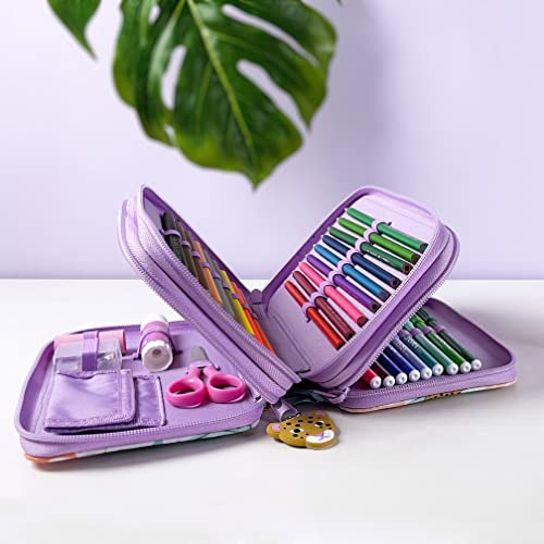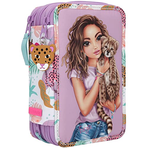 Depesche TOPModel Urban Jungle 10761 - Astuccio a 3 scomparti con motivo giungla con stampa TopModel, con ciondolo Leo, colore: Lilla con matite colorate, righello, forbici e molto altro ancora.