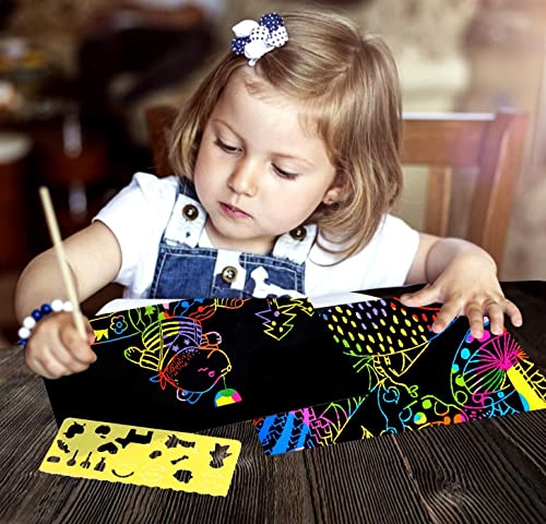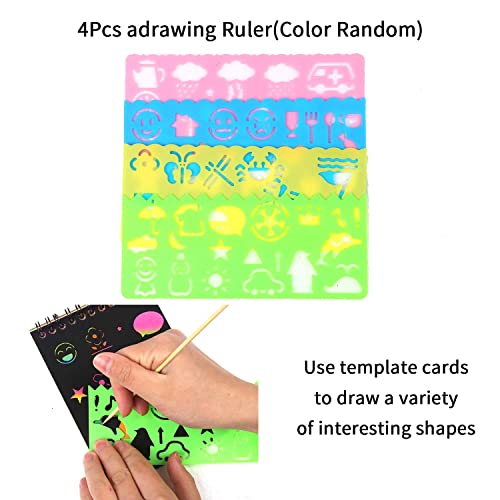 【Kit disegno】Include 3 confezioni di carta da graffio,6 penne stilo in legno e 4 righelli modello,siete liberi di fare questi disegno arcobaleno e creare disegni vivaci con colori ricchi e creatività.