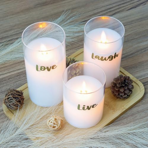 JHY DESIGN Set di 3 Candele LED a fiamma mobile a batteria di vetro Candele senza fiamma in vera cera Candele elettriche tremolanti con timer da 6 ore per Festa Nozze Natale (LIVE LOVE LAUGH)