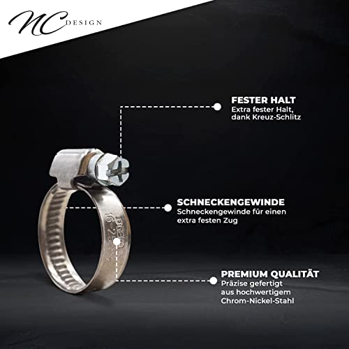 Materiale di qualità: W2 a norma DIN 3017, cinturino e alloggiamento viti: acciaio inox V4A, resistente alla ruggine. Vite esagonale: acciaio blu cromato, fascette stringitubo in acciaio inox di NC Design.