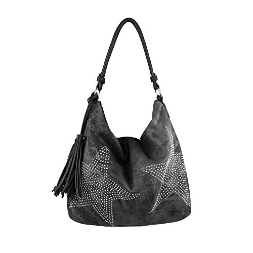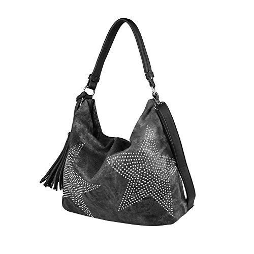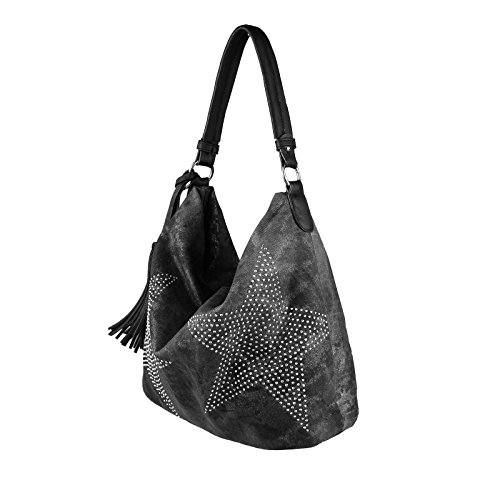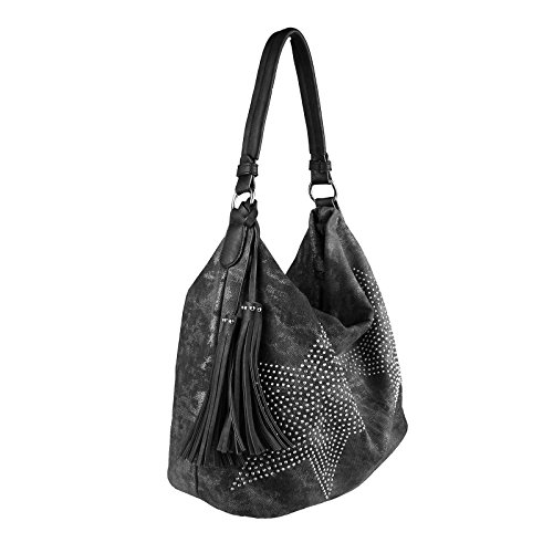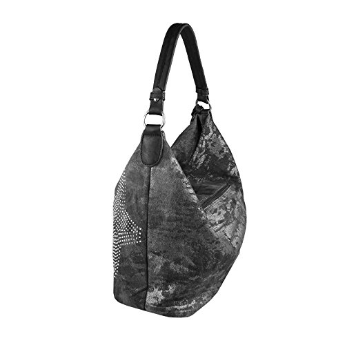 OBC design italiano XXL donna Stella Borsetta Tela Cotone In strass Oro-argento Bowling Borsa marsupio Hobo-Bag Manico Shopper CrossOver - Nero, ca.: 48x35x17 cm (BxHxT)