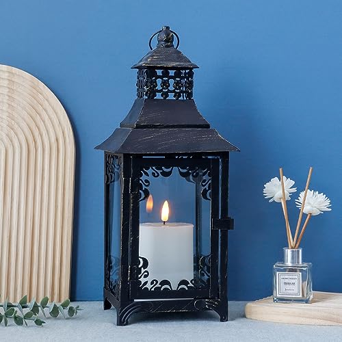 【LANTERNA A CANDELA IN METALLO VINTAGE】 - La lanterna a candela vintage a grandezza naturale, con lastre di vetro, parte superiore speciale e cornice con motivo invecchiato dal nero con polvere dorata, crea un'aura di fascino del vecchio mondo - Aggiunge un tocco meraviglioso a qualsiasi spazio con il grazioso connubio di bellezza e praticità - Puntelli accattivanti per tavoli, bar, cortili, portici;