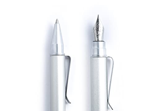 NAVA DESIGN - Set Penna a Sfera (Refill Schmidt P900M) e Penna Stilografica (Pennino Schmidt FH241) in Alluminio con Clip in Metallo e Cappuccio Magnetico, Colore Argento - Dimensioni 11 cm