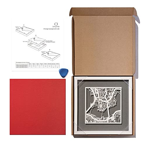 O3 DESIGN STUDIO Glasgow Paper Cut Map incorniciata, mappa bianca, cornice bianca, 23x23 cm, confezione regalo, 4 colori di sfondo, autocutore, Paper Art