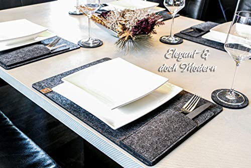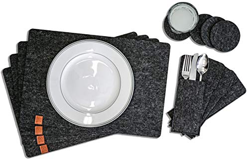 Daro Design - in questo set riceverete 4 tovagliette, 4 sottobicchieri, 4 tasche per posate - con le nostre eleganti tovagliette in colore antracite che una miscela di grigio scuro e nero rende la vostra presentazione da tavolo sempre una bella figura - discreta ma di alta qualità - la piccola applicazione in pelle dà al tutto l'ultimo tocco - un'attrazione assoluta