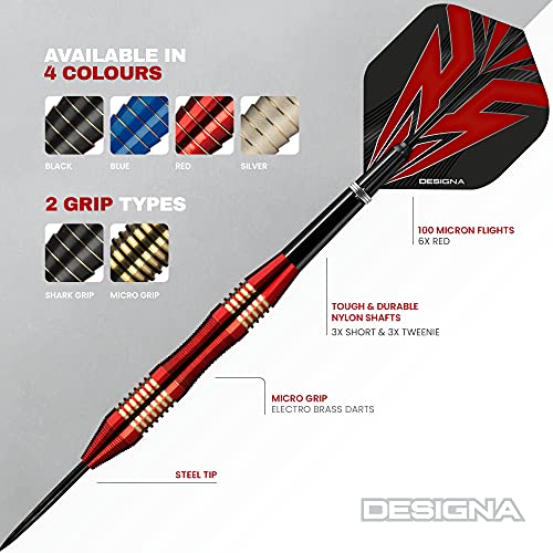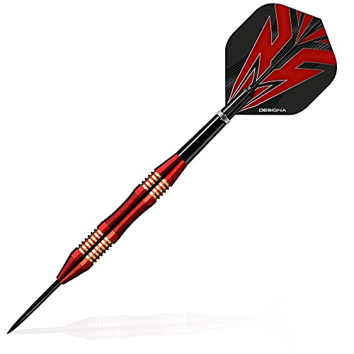 DESIGNA DARTS Mako | Set di freccette in ottone con punta in acciaio da 23 g, con fusto smerlato, con 6 alette standard, 6 steli, carte di pagamento e custodia, M2, rosso