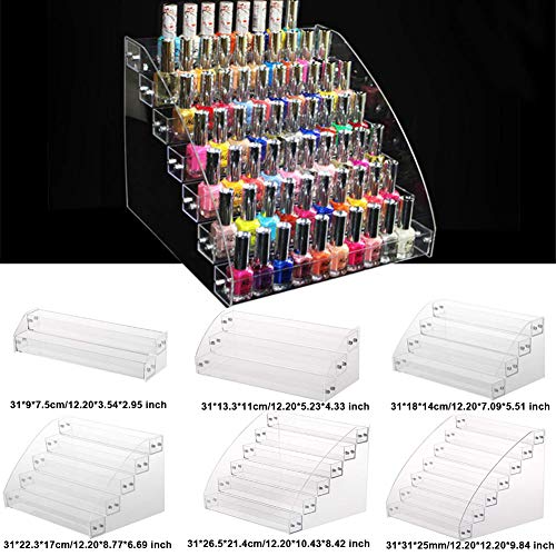 【Design professionale】Espositore per smalti in acrilico trasparente con ripiani trasparenti e ringhiere per fornire la massima visibilità al nostro supporto per unghie. Il design a scala a strati può essere perfetto per esporre lo smalto e altre cose