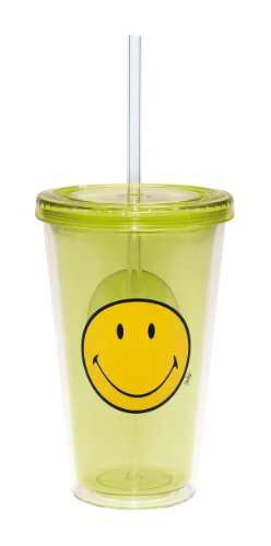 ZAK Designs 6187-0850 - Bicchiere da bibita Doppio-Strato con Cannuccia Integrata, Decorato con Smiley, capacità: 48 cl, Colore: Verde