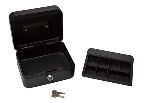 Deskit Cassetta Portasoldi di 15cm con 2 Chiavi e Ripiano per Fondo Cassa - Riponi al Sicuro i Tuoi Soldi Mentre sei in Viaggio (Nero)