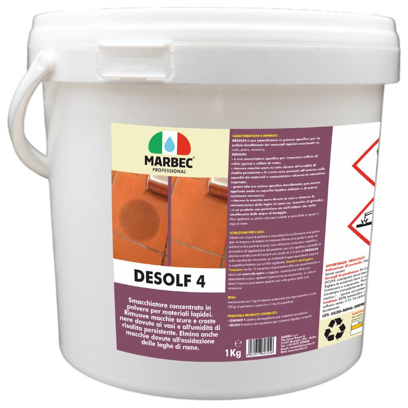 Caratteristiche e impiego: DESOLF4 è uno smacchiatore in polvere per la pulizia desolfatante dei materiali lapidei assorbenti (es. cotto, pietra, cemento). DESOLF4: è uno smacchiatore specifico per rimuovere solfato di calcio (gesso) e solfato di rame;