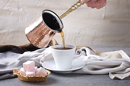 Dimensioni ottimali: capacità 150 ml. Capacità: 150 ml. La lunghezza del vaso è di 7,5 cm e la larghezza è di 7,5 cm. La lunghezza del manico è di 11,5 cm. Prodotto in Turchia. È possibile utilizzarlo su stufe a gas, elettriche, in ceramica e anche su sabbia calda. Questa pentola in rame non è compatibile con il piano cottura a induzione. È usato per preparare caffè turco, greco, marocchino o arabo. Inoltre, poiché è piccolo e leggero, è ideale per viaggi, campeggio, picnic all'aperto.