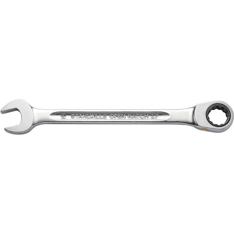 Chiave a cricchetto per anelli di mazza. N. 17 F - Cromata - Acciaio legato al cromo - Dentatura fine. 72 denti - Testa del cricchetto diritta - Posizione della bocca angolata di 15°.