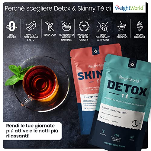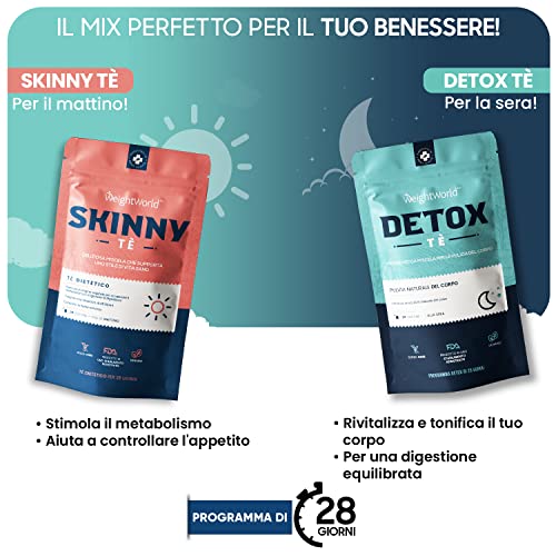 Detox Tea + Skinny Tea - Tisane Drenanti con 56 Bustine Mattina & Sera - Combo Detox, Drenante, Depurativo, Antiossidante - Contiene Tè Verde, Zenzero, Dente di Leone, Menta - Integratore Dietetico
