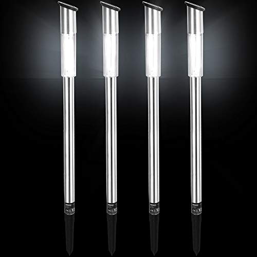 FORNITURA / DATI TECNICI Set di 4 lampade solari con sensore crepuscolare / Dimensioni: altezza 70 cm, Ø 5 cm / Colore della luce: bianco / Tempo di illuminazione: 8 ore / tipo di alimentazione: solare / Classe di protezione: IP44 (a prova di schizzi) / Materiale: acciaio inox e plastica