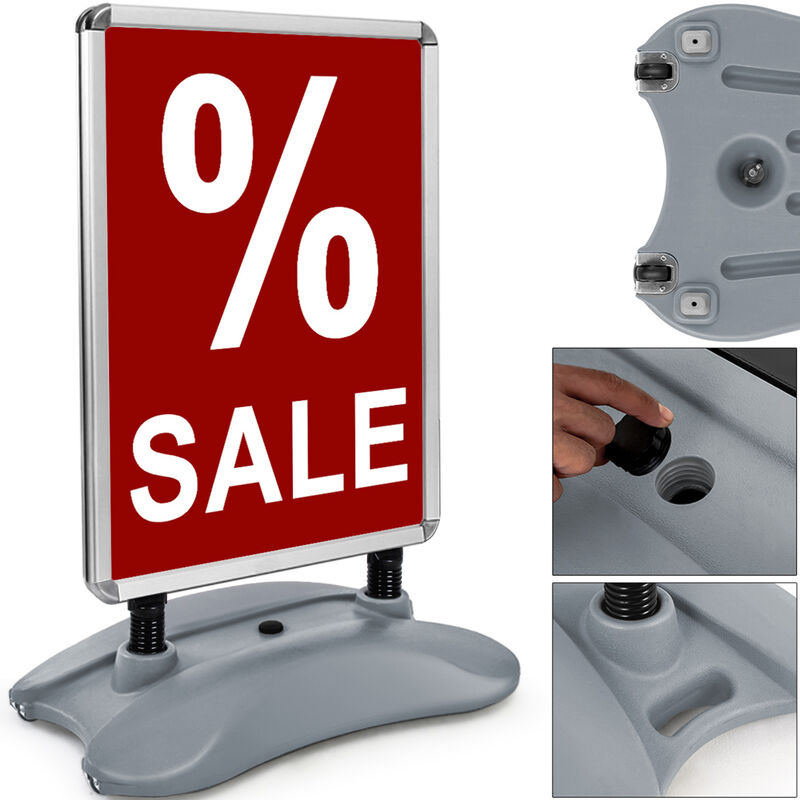 Stand pubblicitario bifacciale ottimo in caso di vento e intemperie Grazie al serbatoio da 25 litri riempibile e alle molle elastiche in acciaio, resiste a tutte le condizioni atmosferiche. Questo modello è inoltre dotato di rotelle integrate nel lato del supporto, che ne facilitano il trasporto. Il modello è protetto dalle intemperie e dalla sporcizia grazie a 2 pellicole. Il sistema a scatto facilita l'inserimento e la sostituzione dei manifesti. Telaio in alluminio con sistema a scatto - rotelle integrate lateralmente - formato poster A1. Vantaggi del prodotto: - Guide di fissaggio in alluminio sistema a click - Formato poster A1 - Telaio in alluminio con angoli arrotondati - serbatoio da 25 litri per il piede, riempibile con acqua o sabbia - adatto per uso interno ed esterno - L'ampia base di appoggio e le 2 molle garantiscono la stabilità - protezione del supporto su entrambi i lati con pellicola - Ruote integrate sui lati per un facile trasporto Dati tecnici: - Dimensioni