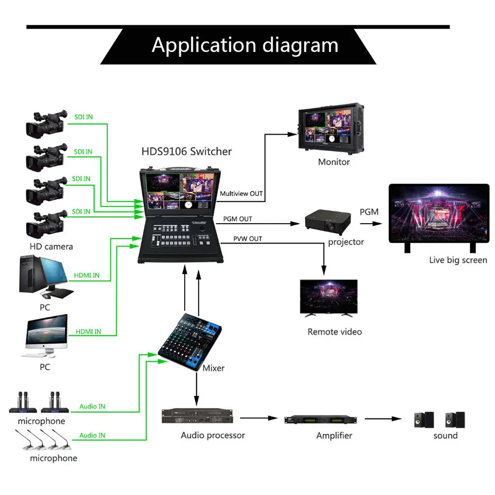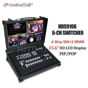 DeviceWell HDS9106 6 channel Guide Switcher SDI HDMI Portable New Media Live Broadcasts Video Switcher with 15.6" Screen Monitor