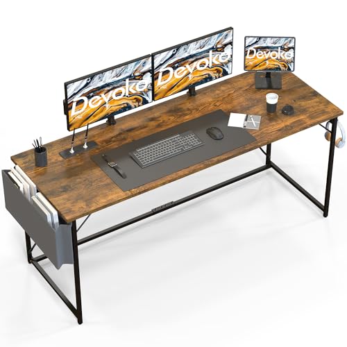 Devoko Tavolo per computer da 140 cm (55 pollici), scrivania per PC stabile, moderno e semplice tavolo da ufficio per la casa, ufficio, supporto per cuffie, custodia portaoggetti, marrone vintage