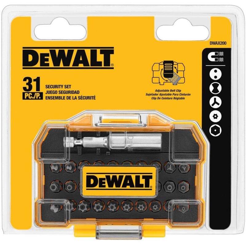 Dewalt DWAX200 - Set di avvitatori di sicurezza, 31 pezzi. Questo set è specificamente progettato con punte di sicurezza per viti antimanomissione. La custodia include una clip da cintura regolabile per un comodo accesso e portabilità. Il set include: 9 punte di sicurezza a stelle: T8, T10, T15, T20, T25, T27, T30, T35, T40. (6) punte esagonali di sicurezza: 5/16 pollici, 3/32 pollici, 7/64 pollici, 1/8 pollici, 9/64 pollici, 5/32 pollici. (4) Sicurezza esagonale - Metrica: 2 mm, 2,5 mm, 3 mm, 4 mm. (4) Punte per chiave: 4, 6, 8, 10. (4) Tri-Wing: 1, 2, 3, 4. (3) Tipo di frizione G: 6, 8, 10. (1) Bit Tip Holder.