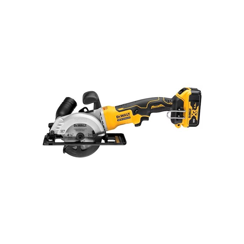 Sega circolare compatta 115mm XR 18V 2x5.0Ah Design ergonomico migliorato con impugnatura in gomma per migliora il comfort dell'utilizzatore Lama in carburo 165mm 16 denti per tagli senza sbavature Regolazione della profondità di taglio con scala di facile lettura La sega circolare compatta a batteria DCS571 è perfetta per il taglio di materiali in lastre come OSB, pavimenti e pannelli di cemento*, per il taglio di pannelli di accesso ai pavimenti, per il taglio di listelli per tetti e per molte altre applicazioni in cantiere. Il motore brushless DEWALT e la batteria XR da 18 V offrono una profondità di taglio massima di 38 mm e di 25 mm a 45°, mentre il soffiatore di polvere incorporato e la porta per la polvere compatibile con Air Lock rimuovono i detriti dalla linea di taglio.Altre caratteristiche includono il freno elettronico per garantire un arresto rapido e sicuro della lama, la regolazione della profondità e dello smusso senza l'ausilio di utensili e il gancio per travi. *Il