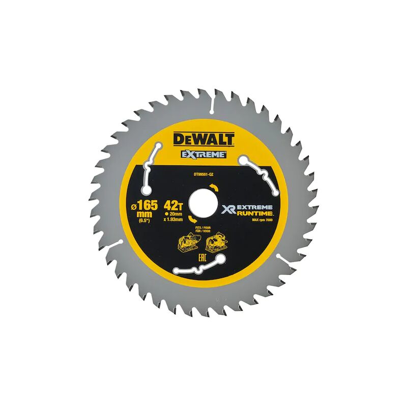 Lama per sega circolare XR EXTREME Runtime 165mm Alesaggio 20mm 42T For use with XR FlexVolt range and all compatible corded and cordless circular saws, mitre saws and table saws Optimised for cordless with up to 2x more cuts per charge C3 next gen carbide with up to 3 regrinds Panoramica del Prodotto XR Extreme Runtime accessories are designed to work with battery powered power tools. Characteristics of these accessories have been fine tuned to deliver maximum productivity from your cordless power tool. Specifiche Lunghezza del prodotto 12 in Direzione del dente In senso antiorario Altezza prodotto 2 in Numero di denti 42 Larghezza del prodotto 12 in Diametro foro 20 mm Diametro lama 165 mm Numero di pezzi 1 Spessore Kerf 1.76 mm Materiale di applicazione Legno