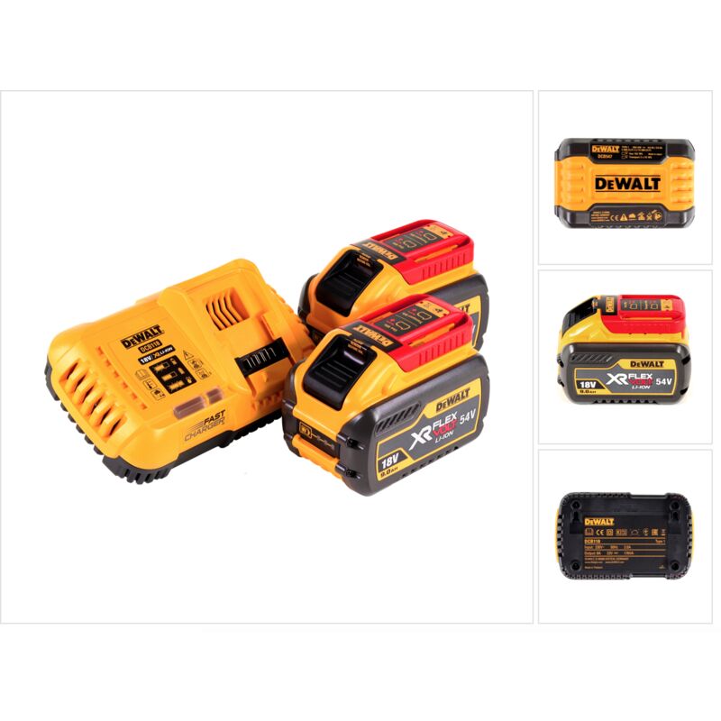 Dotazione: - 1x Caricabatterie rapido DeWalt DCB 118 XR FlexVolt 54 V / 18 V - 2x Batterie DeWalt DCB 547 da 54V / 18V - 9,0 Ah Li-Ion FlexVolt Descrizione prodotto: Il caricabatterie rapido DeWalt 118 carica tutte le batterie DEWALT XR da 18,0 Volt fino a 8 ampere e le batterie DeWalt FLEXVOLT (54,0 o 18,0 Volt a max. 6,0 Ah). Inoltre, il processo di carica a 2 stadi DeWalt del DCB 118 DeWalt con speciale raffreddamento a ventola consente una lunga durata della batteria con la massima capacità di stoccaggio grazie ad una carica particolarmente delicata. Il display a LED integrato del DeWalt DCB 118 fornisce informazioni sullo stato della batteria e della carica e garantisce il massimo comfort sul lavoro. Inoltre, il caricabatterie rapido DCB 118 è adatto anche per il montaggio a parete e le sue dimensioni compatte lo rendono ideale per un'installazione ottimale. Incluso nel caricatore rapido ci sono 2 batterie DeWalt DCB 547 54 V 18 V 9 Ah Li-Ion FlexVolt. Le nuove batterie FLEXVOLT