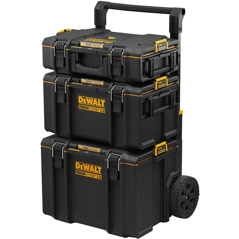 Trolley porta utensili DeWALT Toughsystem Tower kit composto da: DS450 vasca con ruote DS300 cassetta portautensili con vaschetta amovibile DS150 cassetta Organizer portaminuterie. Vantaggi Nuova maniglia rimovibile per una più agevole movimentazione del trolley Nuove chiusure frontali Forniscono una agevole apertura con una sola mano Una guarnizione nel coperchio garantisce resistenza a polvere e getti d'acqua (IP65) per resistere alle condizioni atmosferiche più avverse Nuove ruote ad alta resistenza da 8 pollici Targhetta nome esterna Consente all'utilizzatore di etichettare i moduli per una facile identificazione dei contenuti Nuovo occhio per lucchetto rinforzato in metallo Una ulteriore sicurezza per i tuoi contenuti Predisposizione per Tag Tool Connect alloggio interno per tag tool connect per poter tracciare la posizione della valigetta e dei tuoi elettroutensili Nuove maniglie più ampie e resistenti Migliore ergonomia e robustezza Nuova compatibilità mezzo modulo Permette di
