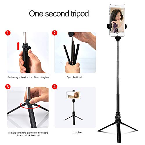 【Angolo di rotazione a 360°】 Tre modi per ruotare il treppiede per selfie stick e la manopola regolabile testa girevole a 270° + supporto girevole per cellulare a 360°, è possibile ruotare e selezionare la modalità di fotocamera orizzontale o verticale per la migliore foto angolare. (Si prega di chiudere la tensione della manopola per evitare che il telefono cada).