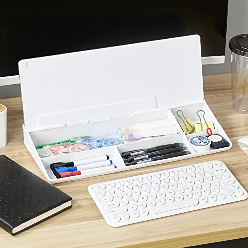 【Scrivania con ampio spazio di archiviazione nascosto】 Dopo aver aperto il pannello di vetro vedrai che la parte inferiore è realizzata in plastica di alta qualità. Ci sono più vani portaoggetti di diverse dimensioni che possono contenere penne, gomme per cancellare, puntine da disegno, graffette, appunti, fermagli e righelli, piccole cucitrici e altri articoli per ufficio. È un accessorio essenziale per l'organizzazione della tua scrivania.