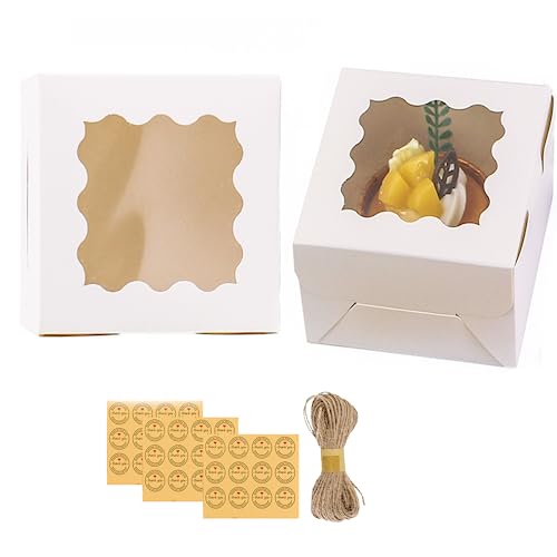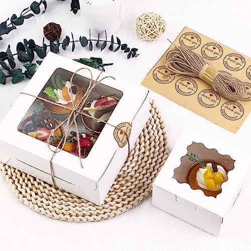 DHAIQC 30 Pezzi Scatole per Cupcake con Finestra e Insert, 1 Fori Scatole per Torta Scatola Per Muffin Catole Per Pasticcini con Corda e Adesivi per Decorare Torte e Trasporto Cupcake