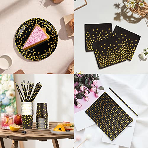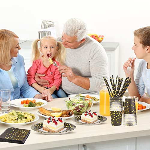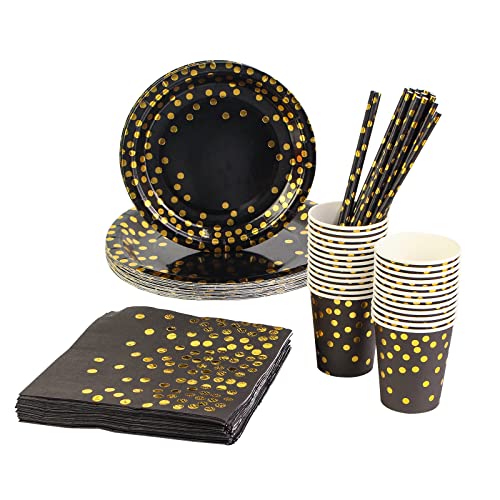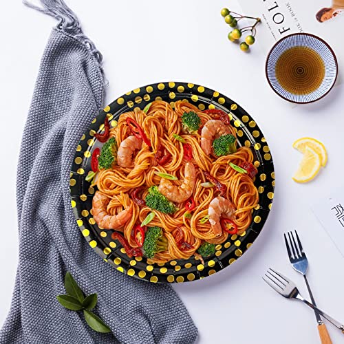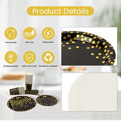 【Design elegante】Questo set di stoviglie per feste compleanno è con sfondo nero e motivo a pois in lamina d'oro, porta un'atmosfera elegante e di alto livello alla tua festa. È una perfetta decorazione della tavola da pranzo per feste di compleanno e festival.