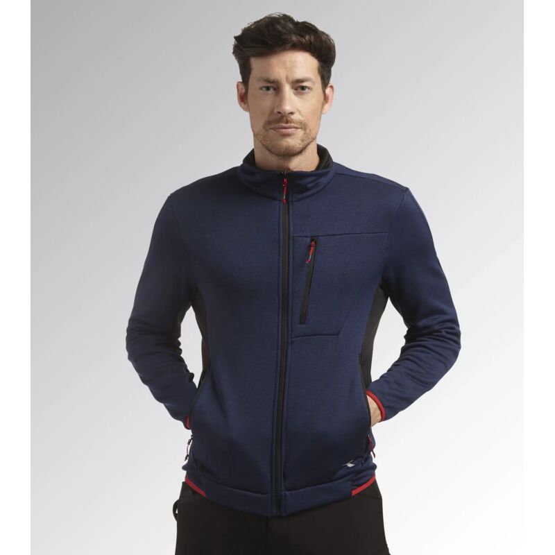Pile tecnico super stretch con finitura esterna liscia, garzato internamente. Taglio ergonomico e look moderno. Due tasche laterali e una frontale con chiusura a zip. Dettagli colorati a contrasto.
