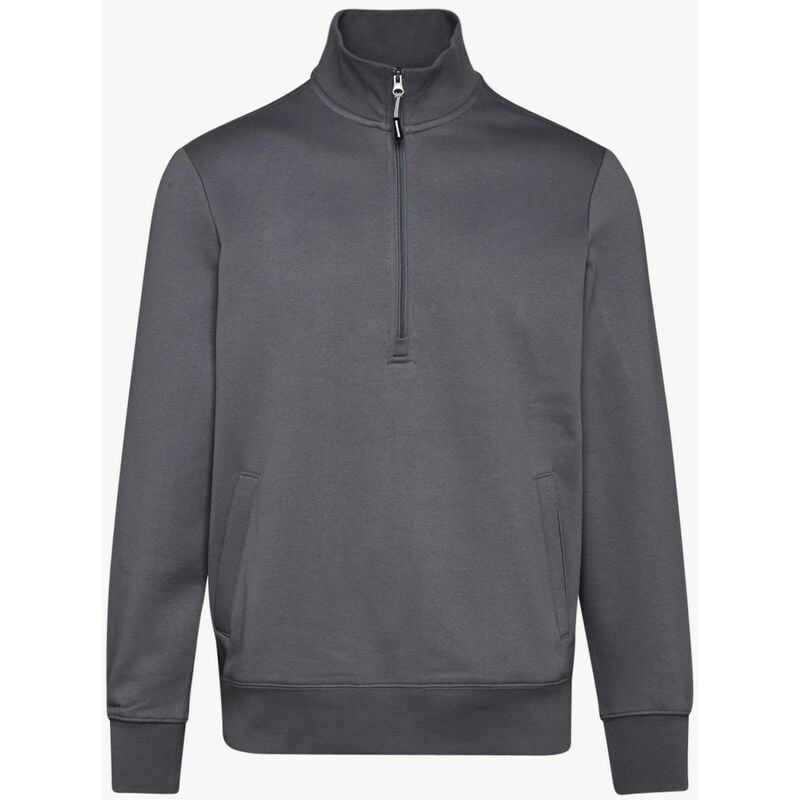 Felpa mezza zip in poliestere e cotone, garzata. Due tasche aperte laterali. Collo, polsini e fondo in costina elasticizzata. Tessuto testato per lavaggi industriali secondo ISO 15797.