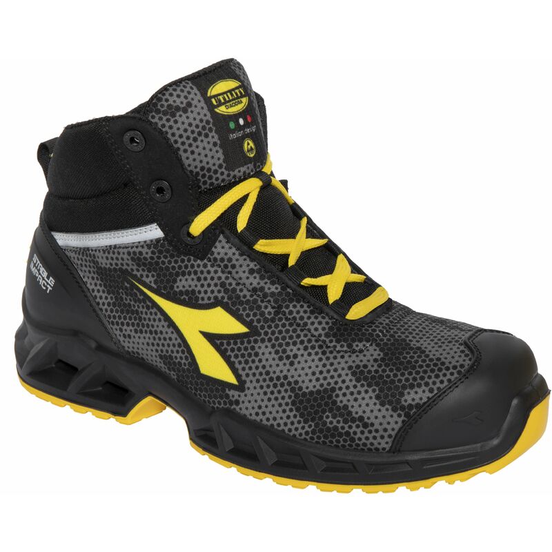 Calzatura di sicurezza mid-cut S3 in tessuto tecnico poliestere 350 gr/m² idrorepellente con tecnologia di ammortizzazione Stable Impact System. Puntale in alluminio 200J. Calzata 11. Fodera Air Mesh con antiscalzante in microfibra, K-SOLE, plantare in PU foam estraibile, traspirante e con carboni attivi. Protezione della punta e del tallone in TPU. ESD.