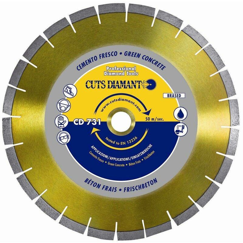 Il disco diamantato di Cuts Diamant per il taglio di cemento fresco con aggregati duri e abrasivi si caratterizza per i settori saldobrasanti di altezza 12 mm. Il disco va applicato su macchine tagliagiunti a scoppio. Diametro: 350 mm;