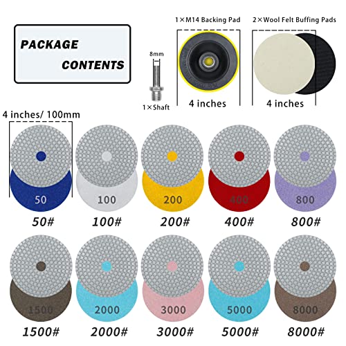 Set completo: questo set di dischi diamantati per la lucidatura comprende 10 pezzi di platorelli diamantati di alta qualità da 100mm (grana 50, 100, 200, 400, 800, 1500, 2000, 3000, 5000, 8000), 2 pezzi di platorelli in feltro di lana per la lucidatura, 1 pezzo di platorello M14 e albero da 8mm.